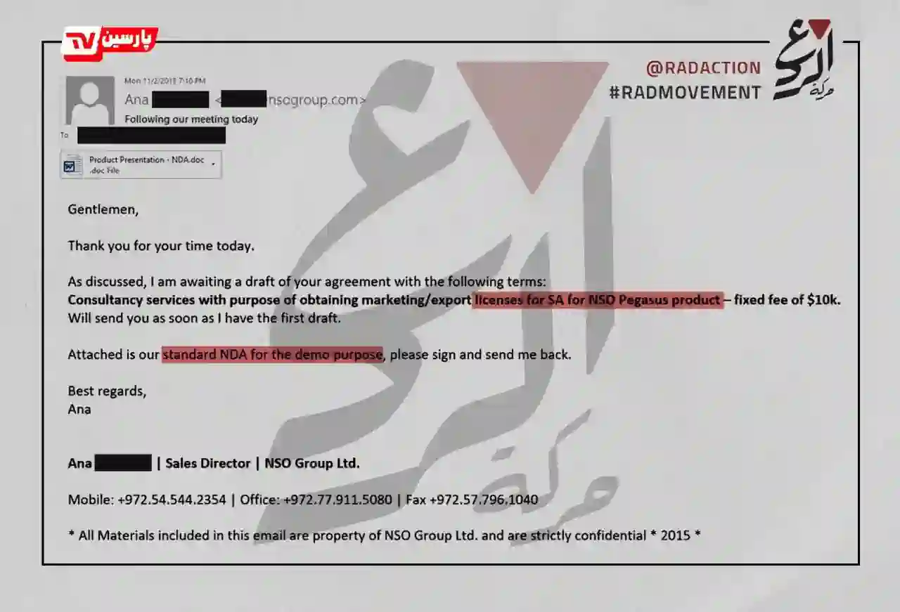 A group called “Harakat Rad’a” has released documents confirming that the Israeli company NSO, under a formal contract dating back to 2015, provided Saudi Arabia with the notorious Pegasus spyware program.