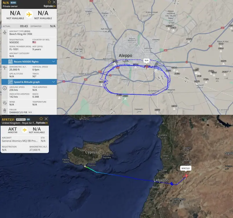 A British combat drone and a U.S. spy plane were spotted on unusual flights over Syria, in another sign of the emerging partnership between the country’s Islamist-led Interim Government and the United States-led coalition.